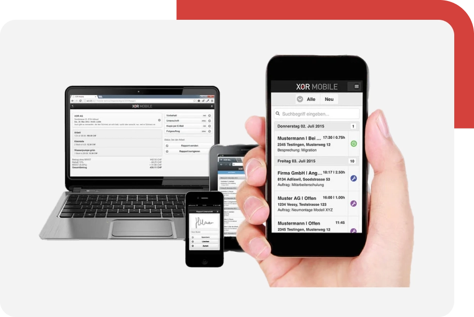 Die Anwendung bildet den Serviceprozess vollständig ab und funktioniert auch ohne Internetverbindung. Durch die strukturierte Erfassung der Leistungen und des Materials über den Touchscreen oder Barcode-Scanner, können Rapporte an Ort und Stelle ausgedruckt, kontrolliert, visiert und in Echtzeit an die Zentrale zur Verrechnung übermittelt werden.
